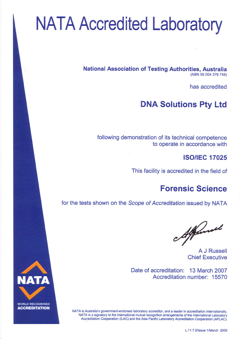 сертификат соответствия требованиям стандарта Международной Организации по Стандартизации (ISO) 17025 (исследования в области судебной медицины) № 15570, выданный Национальной Ассоциацией по контролю исследований (NATA). Это дает возможность DNA Solutions Pty.Ltd. выполнять исследование отцовства для юридических целей, в том числе для подтверждения или оспаривания отцовства и свидетельства эксперта в суде общей юрисдикции, получения свидетельства о рождении или внесения в него изменений и т.д.