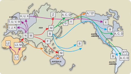 Карта, приведенная ниже, показывает в обобщенной форме некоторые из маршрутов перемещения групп с различными типами профиля Y-хромосомы.