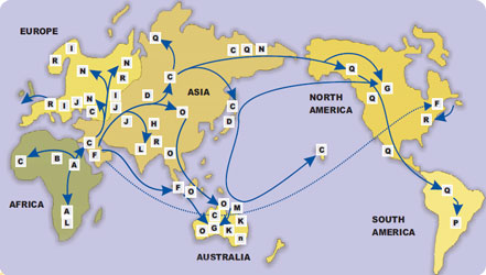 Образец карты в обобщенной форме, иллюстрирующей маршруты миграции некоторых групп.